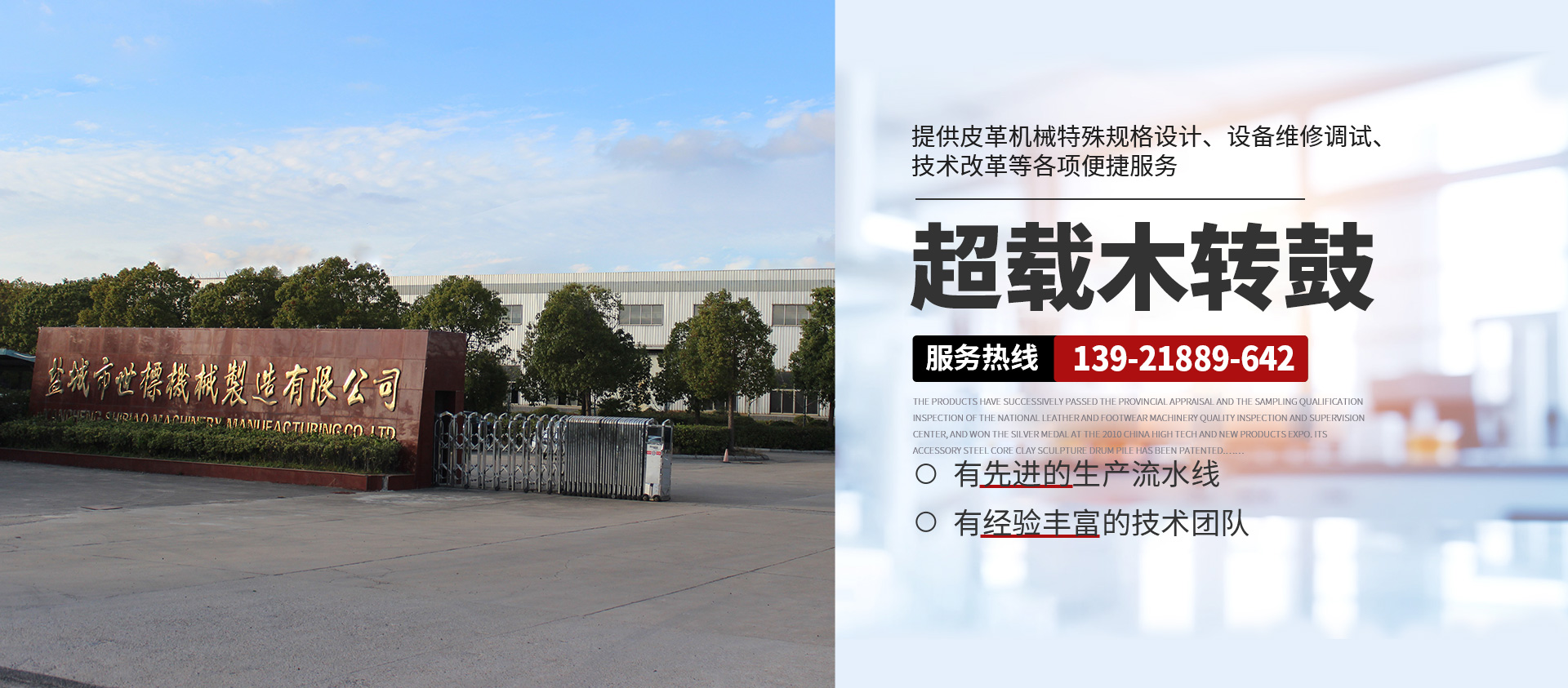 本公司常年提供超載木制轉鼓( 意大利/西班牙版本)、GJOB1-2型懸掛式木制轉鼓、鐵制轉鼓、Y型不銹鋼全自動分格鼓、全自動不銹鋼圓形、八角形摔軟轉鼓、PP染色等多功能轉鼓、HC系列劃槽、不銹鋼試驗轉鼓等皮革機械產品,產品暢銷浙江、山東、廣東、福建、河南、河北、四川、新疆、遼寧等地,且遠銷非洲、東南亞、南美洲、中美洲等多國,深受各大制革廠家的青睞。產品相繼通過省級鑒定和全國皮革、制鞋機械質量檢測監(jiān)督中心的抽樣合格檢驗,在2010中國高新技術、新產品博覽會上一舉榮登銀獎寶座,其配件鋼芯泥塑鼓樁獲 專利權。本公司并向客戶提供皮革機械特殊規(guī)格設計、設備維修調試、技術改革等各項便捷服務,具有健全的檢測體系和可靠的售后服務。